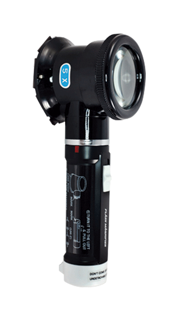 Equipo de inspección que le permitirá comparar la profundidad del perfil de anclaje generado en campo o en el taller por efecto de la limpieza de una superficie metálica por medio de abrasivo "GRIT" blast (granalla angular) contra un disco de referencia con 5 segmentos - cada uno con diferente perfil de anclaje - auxiliado con un lente de aumento iluminado.