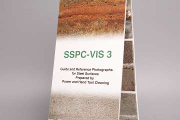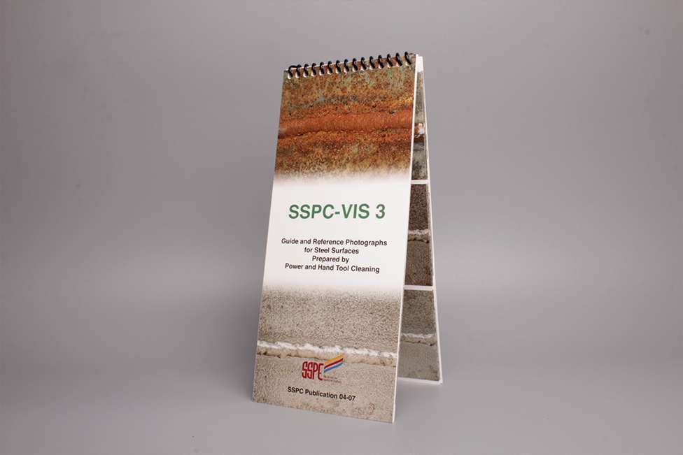 La referencia visual más comúnmente utilizada que incluye más de 50 fotografías a color de superficies de acero oxidado, previamente con y sin recubrimiento, antes y después de limpieza por impacto de abrasivo en seco. Los requisitos de limpieza para las condiciones ilustradas están definidas por las especificaciones de preparación de superficies SSPC para acabados de impacto de metales blancos (SP 5), casi blancos (SP 10), comercial (SP 6), industrial (SP 14) y cepillado (SP 7). Fotografías de apéndice muestran variaciones en superficies de metal blanco provocadas por abrasivos metálicos y no metálicos diferentes, profundidad de perfil, ángulo de vista e iluminación.