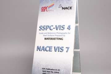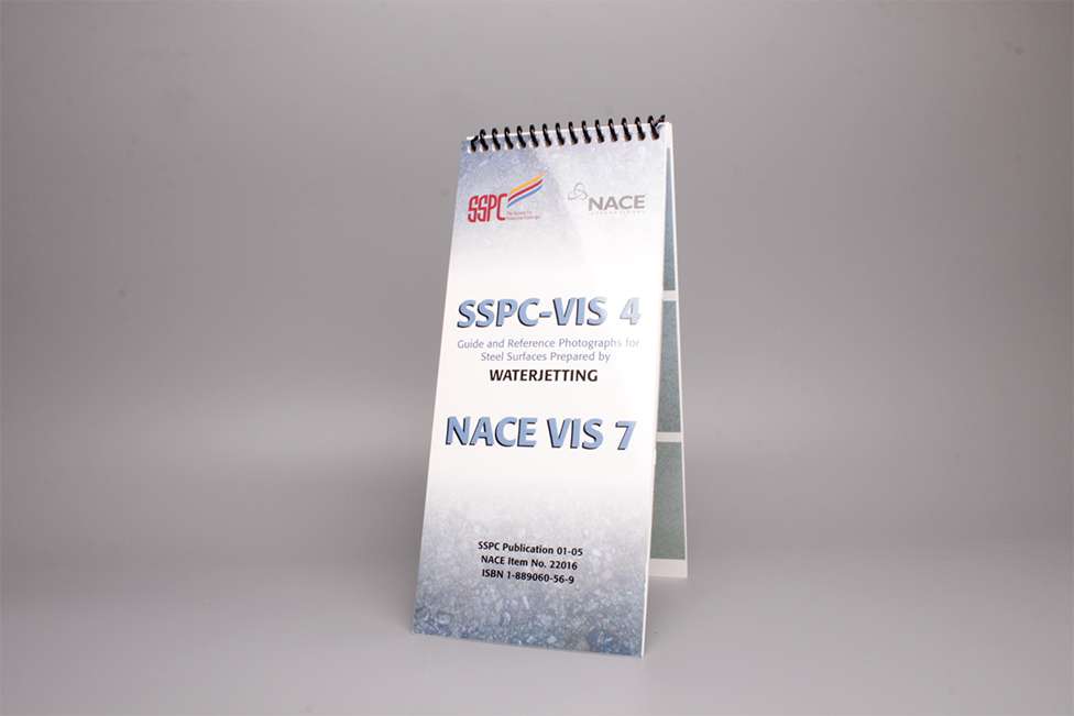 La referencia visual más comúnmente utilizada que incluye más de 50 fotografías a color de superficies de acero oxidado, previamente con y sin recubrimiento, antes y después de limpieza por impacto de abrasivo en seco. Los requisitos de limpieza para las condiciones ilustradas están definidas por las especificaciones de preparación de superficies SSPC para acabados de impacto de metales blancos (SP 5), casi blancos (SP 10), comercial (SP 6), industrial (SP 14) y cepillado (SP 7). Fotografías de apéndice muestran variaciones en superficies de metal blanco provocadas por abrasivos metálicos y no metálicos diferentes, profundidad de perfil, ángulo de vista e iluminación.