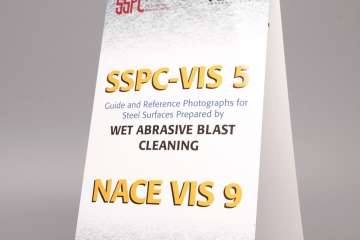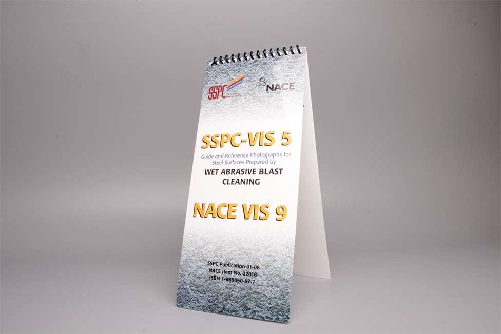 La referencia visual más comúnmente utilizada que incluye más de 50 fotografías a color de superficies de acero oxidado, previamente con y sin recubrimiento, antes y después de limpieza por impacto de abrasivo en seco. Los requisitos de limpieza para las condiciones ilustradas están definidas por las especificaciones de preparación de superficies SSPC para acabados de impacto de metales blancos (SP 5), casi blancos (SP 10), comercial (SP 6), industrial (SP 14) y cepillado (SP 7). Fotografías de apéndice muestran variaciones en superficies de metal blanco provocadas por abrasivos metálicos y no metálicos diferentes, profundidad de perfil, ángulo de vista e iluminación.